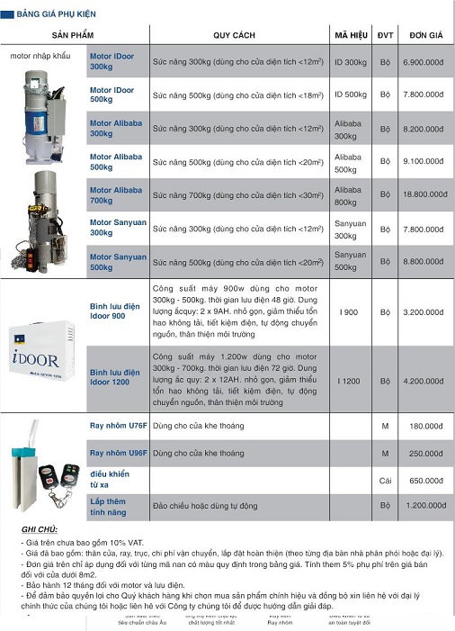 Giá đã bao gồm: Thân cửa, ray, trục, chi phí vận chuyển, lắp đặt hoàn thiện (theo từng địa bàn nhà phân phối hoặc đại lý)